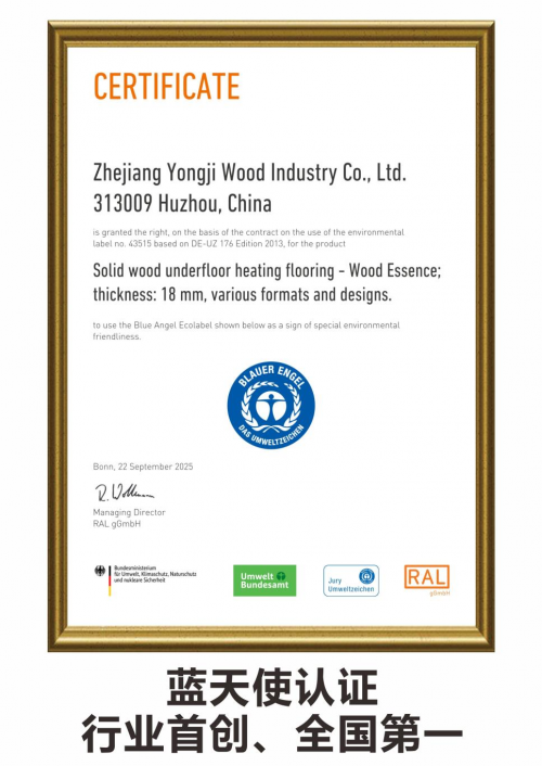 近日,永吉地板传来重磅喜讯——产品凭借卓越的环保性能与严苛的品质把控,成功斩获全球首个且最具权威性的环保认证体系——蓝天使认证(Blauer Engel),一举创下行业首创 全国第1的荣誉。