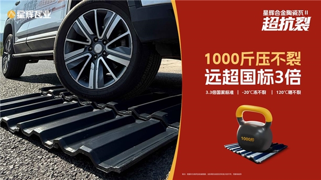 为了更直观地展现产品的卓越品质,星辉瓦业针对合金二代产品的强度进行了严苛的重压抗裂测试。测试采用车压瓦的形式——驾驶1.4吨汽车直接压过瓦片,最终瓦片完好无损。